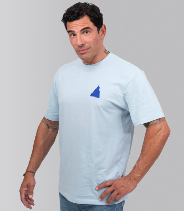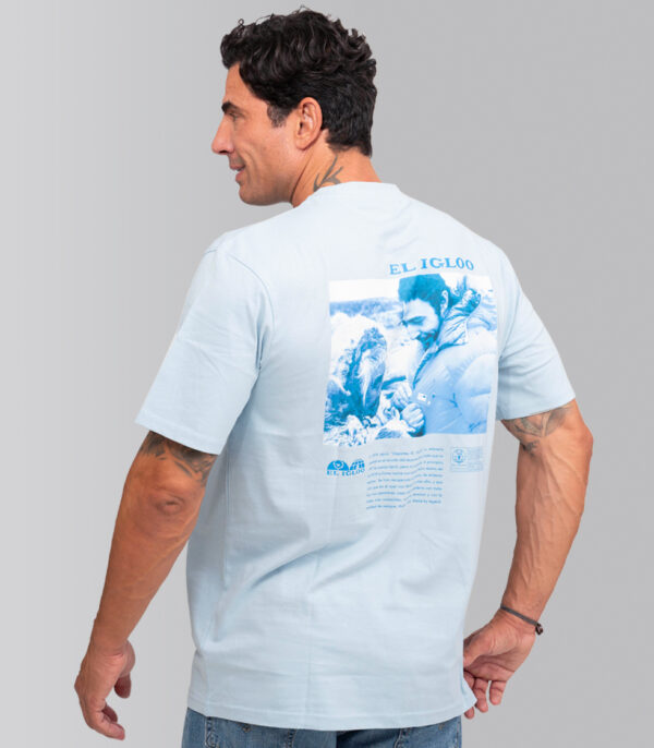 Camiseta con ajuste slim fit y color celeste (chambray blue). Cuenta con etiqueta especial en el cuello y con diseños originales de Pedro Gómez Madrid con el diseño El Igloo en la parte frontal y Esquimal en la parte trasera.