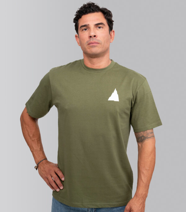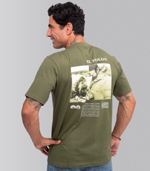Camiseta color cypress, con etiqueta especial en el cuello y con diseños originales de Pedro Gómez Madrid. Cuenta con el diseño montaña pequeña blanca en la parte frontal y Esquimal grande blanco en la parte trasera.