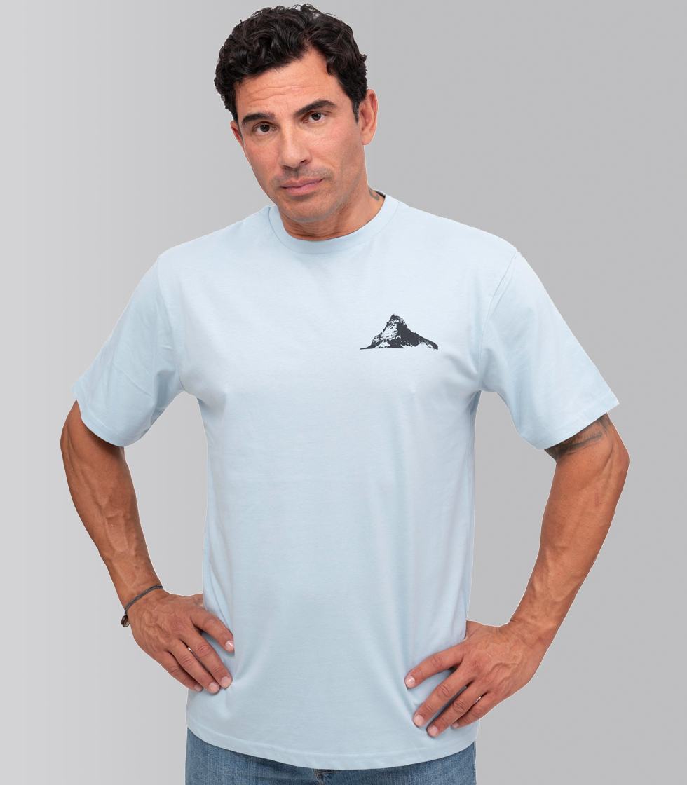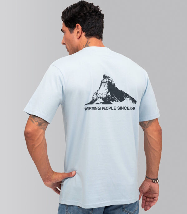 Camiseta color azul celeste (chambray blue), con etiqueta especial en el cuello y con diseños originales de Pedro Gómez Madrid. Cuenta con el diseño Mattherhorn pequeño negro en la parte frontal y Matterhorn grande Warming People en la parte trasera.
