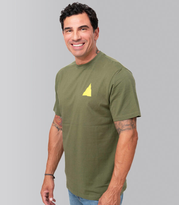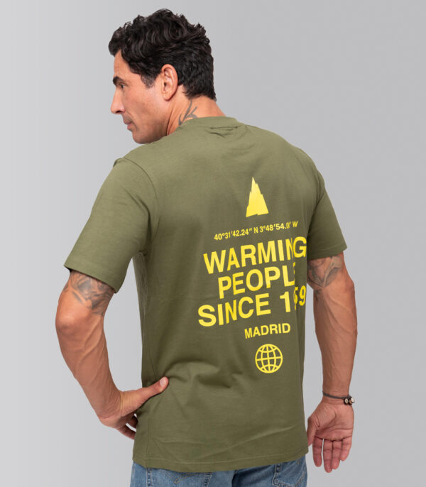 Camiseta color cypress, con etiqueta especial en el cuello y con diseños originales de Pedro Gómez Madrid. Cuenta con el diseño Warming People montaña pequeña verde lima en la parte frontal y Warming People grande verde lima en la parte trasera.