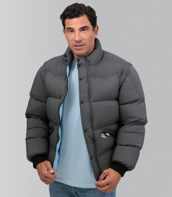 Cuenta con 4 cm más de largo sobre el patrón original, relleno extra de pluma y bolsillos reforzados. Con capucha de plumas desmontable con cinco corchetes en la parte posterior y con cremalleras en las mangas para poder quitarlas y convertir el modelo en chaleco.