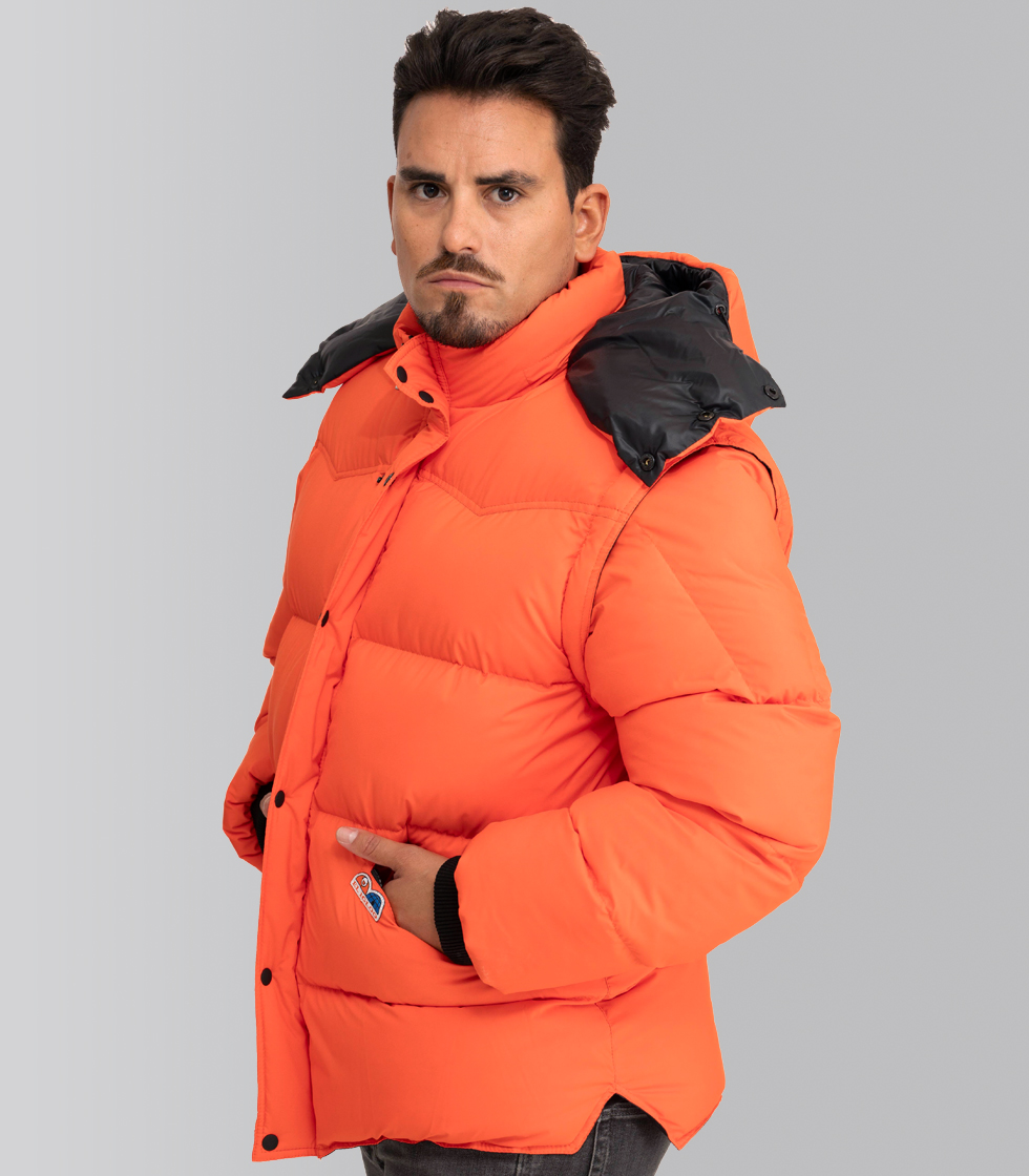 Cuenta con 4 cm más de largo sobre el patrón original, relleno extra de pluma y bolsillos reforzados. Con capucha de plumas desmontable con cinco corchetes en la parte posterior (incluida en el precio) y con cremalleras en las mangas para poder quitarlas y convertir el modelo en chaleco.