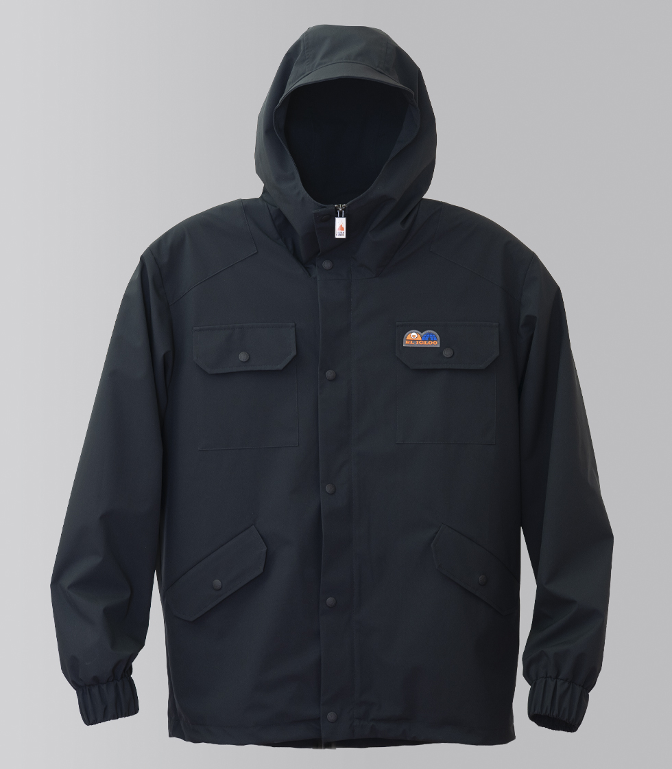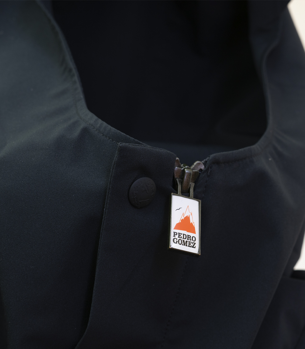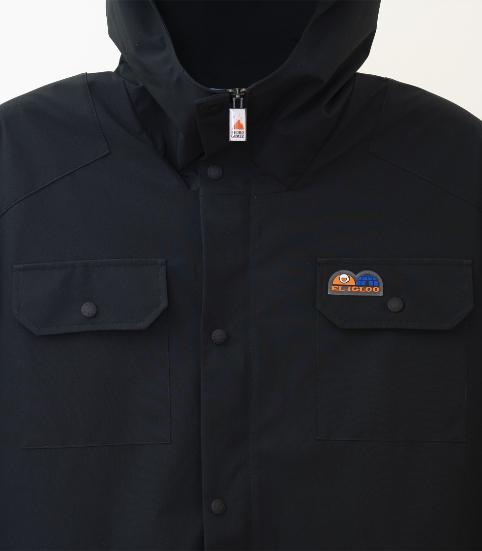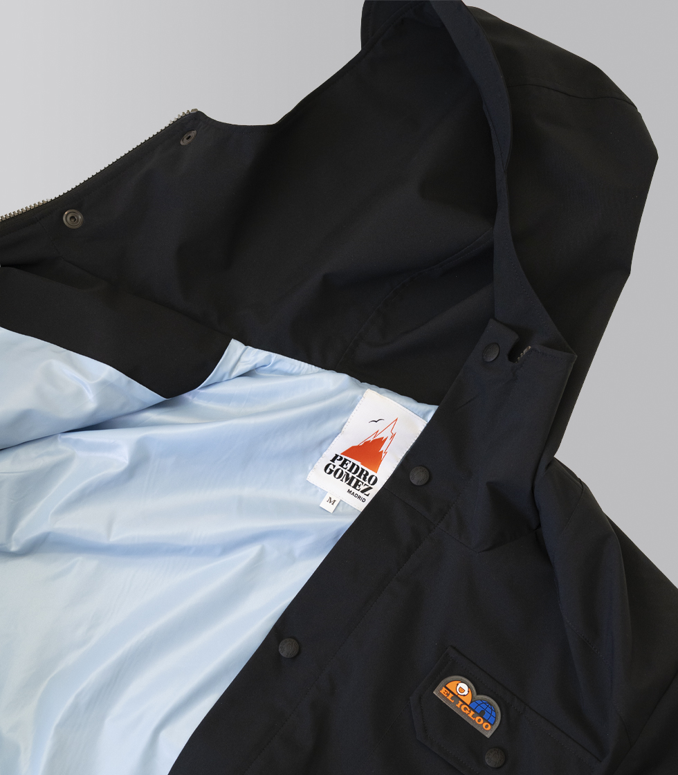 Cuenta con etiqueta engomada de El Igloo en el bolsillo superior izquierdo y varios bolsillos con  diseño actualizado y apertura de corchete personalizado. Así mismo, dispone de cremallera central con diente plateado con logo Pedro Gómez y visera con capucha.
