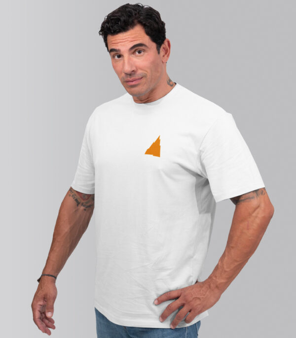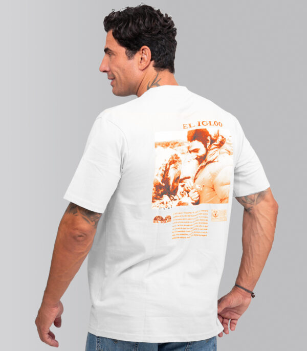 Camiseta color blanco (white), con etiqueta especial en el cuello y con diseños originales de Pedro Gómez Madrid. Cuenta con el diseño Esquimal montaña pequeña naranja en la parte frontal y esquimal grande naranja en la parte trasera.