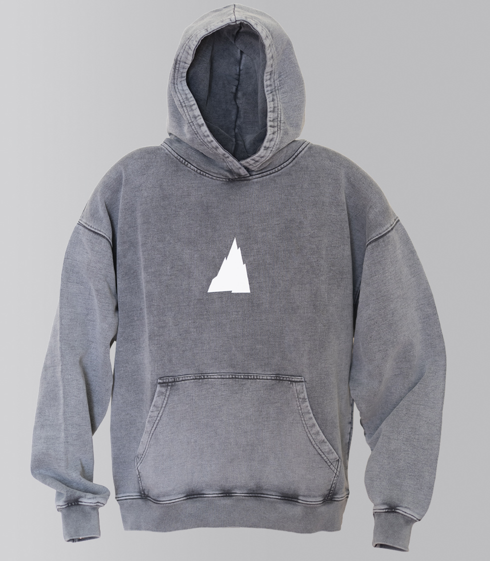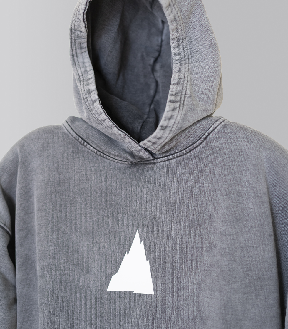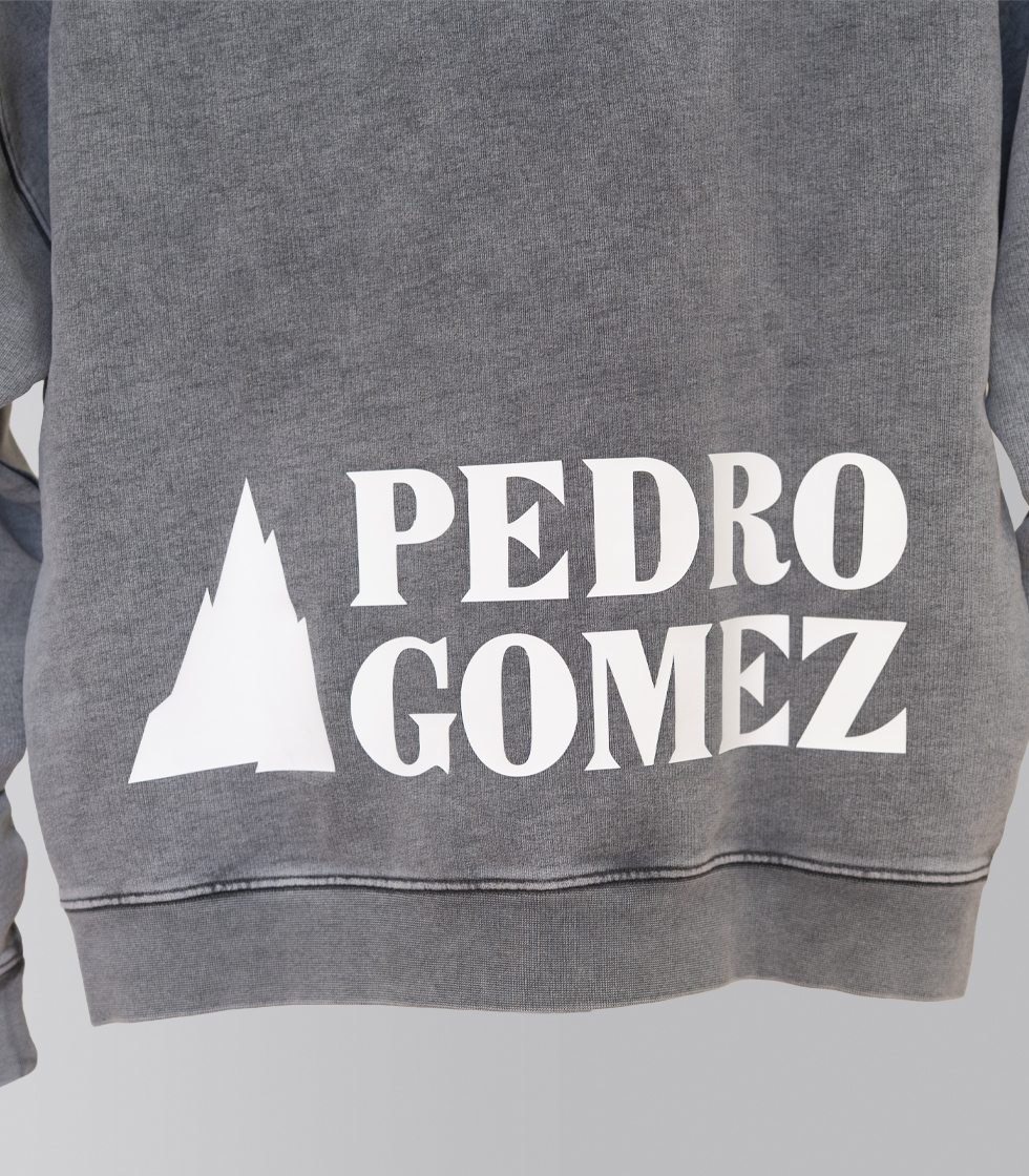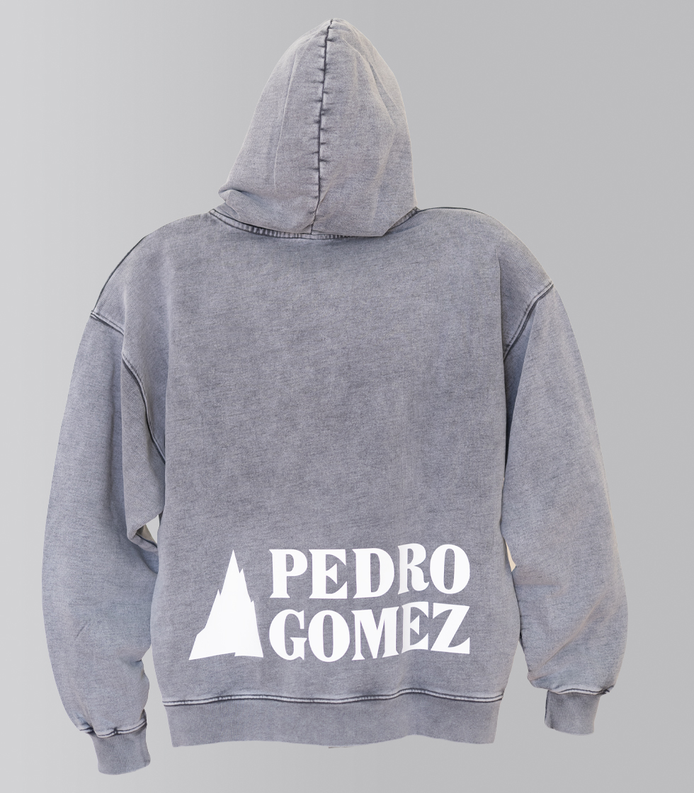 Sudadera color gris y tejido lavado. Cuenta con diseños originales, con la montaña de Pedro Gómez en  la parte frontal y el diseño «Pedro Gómez Madrid» en la parte trasera, ambos en vinilo blanco en relieve.