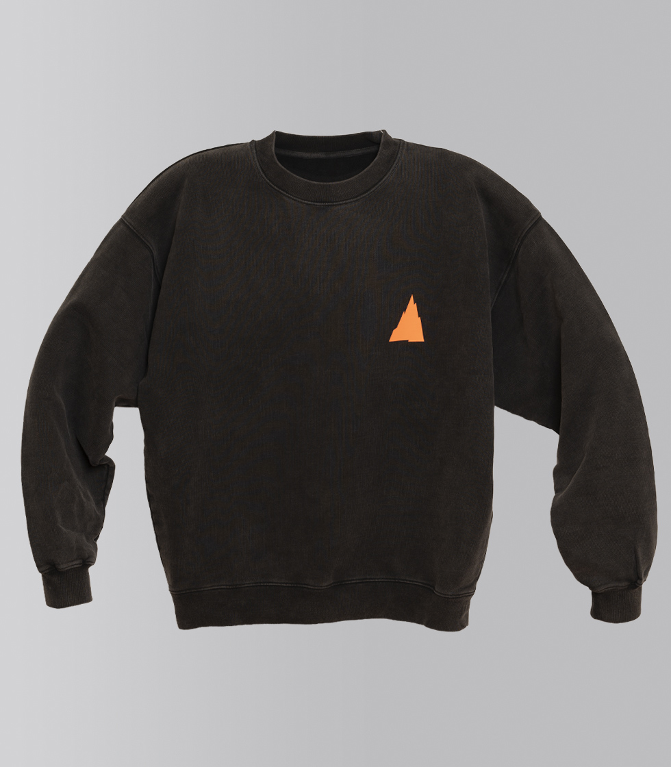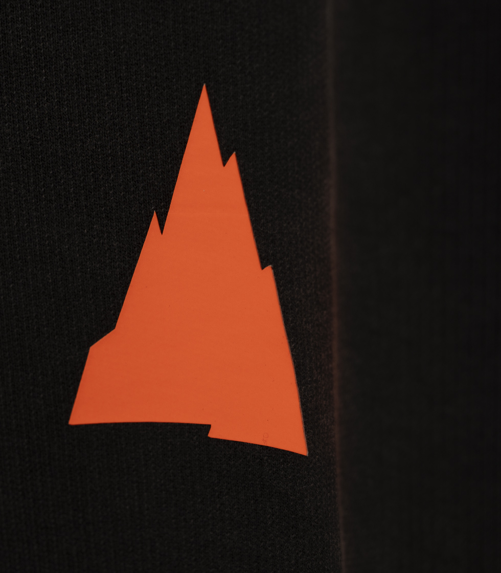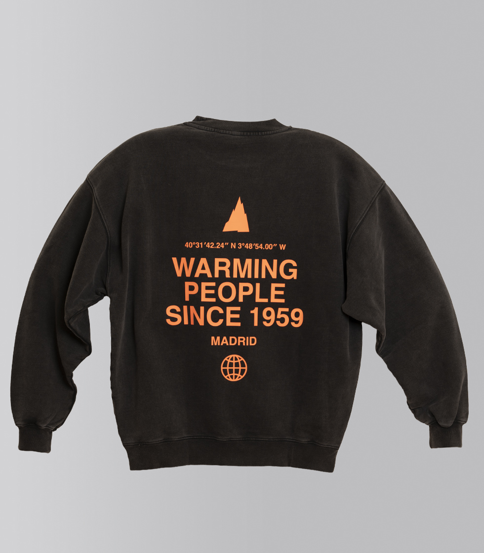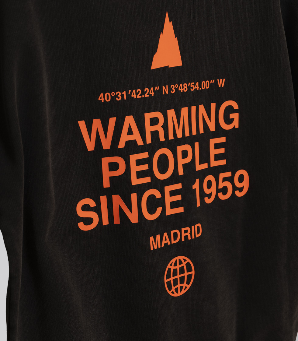 Sudadera color negro y tejido lavado. Cuenta con diseños originales con la montaña de Pedro Gómez en la parte frontal y el diseño «Warming People» en la parte trasera, ambos en vinilo naranja en relieve.